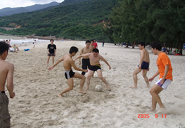 一到海滩,员工们便象激情的小鸟,冲向银色沙滩,投入到碧海的怀抱。一时间,沙滩排球、沙滩足球、沙滩“家家”活动此起彼伏,好一个欢乐祥和、返璞归真的温情世界。“明月出天山,苍茫云海间”,42名员工都成了这一靓丽风景的元素。